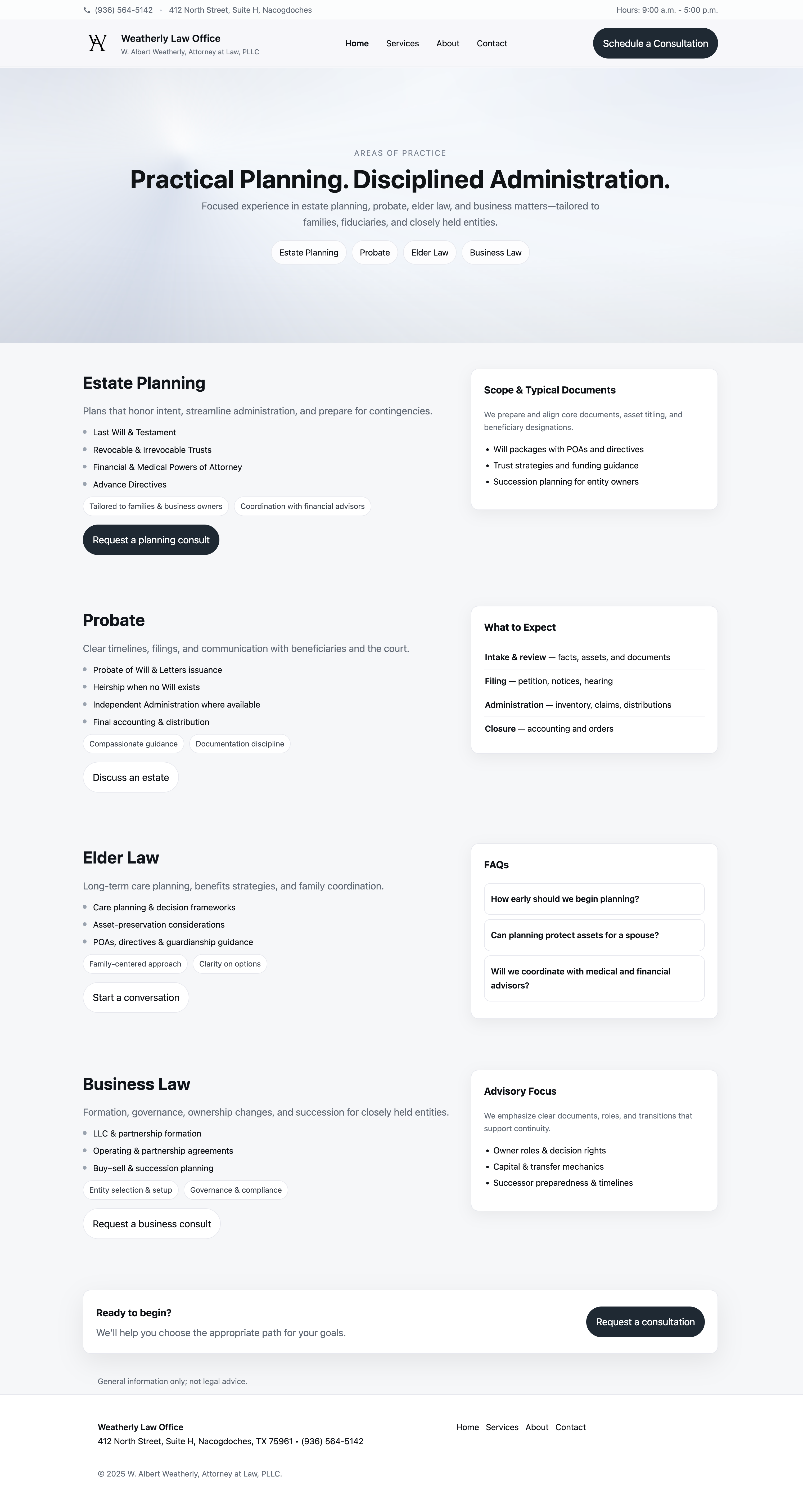 The hero emphasizes rights, experience, and next steps. Below, focused practice tiles, proof modules, and a “speak-with-a-lawyer” footer band all point toward one simple path: request a consultation or call today.