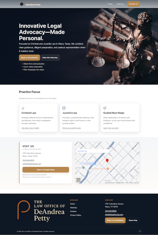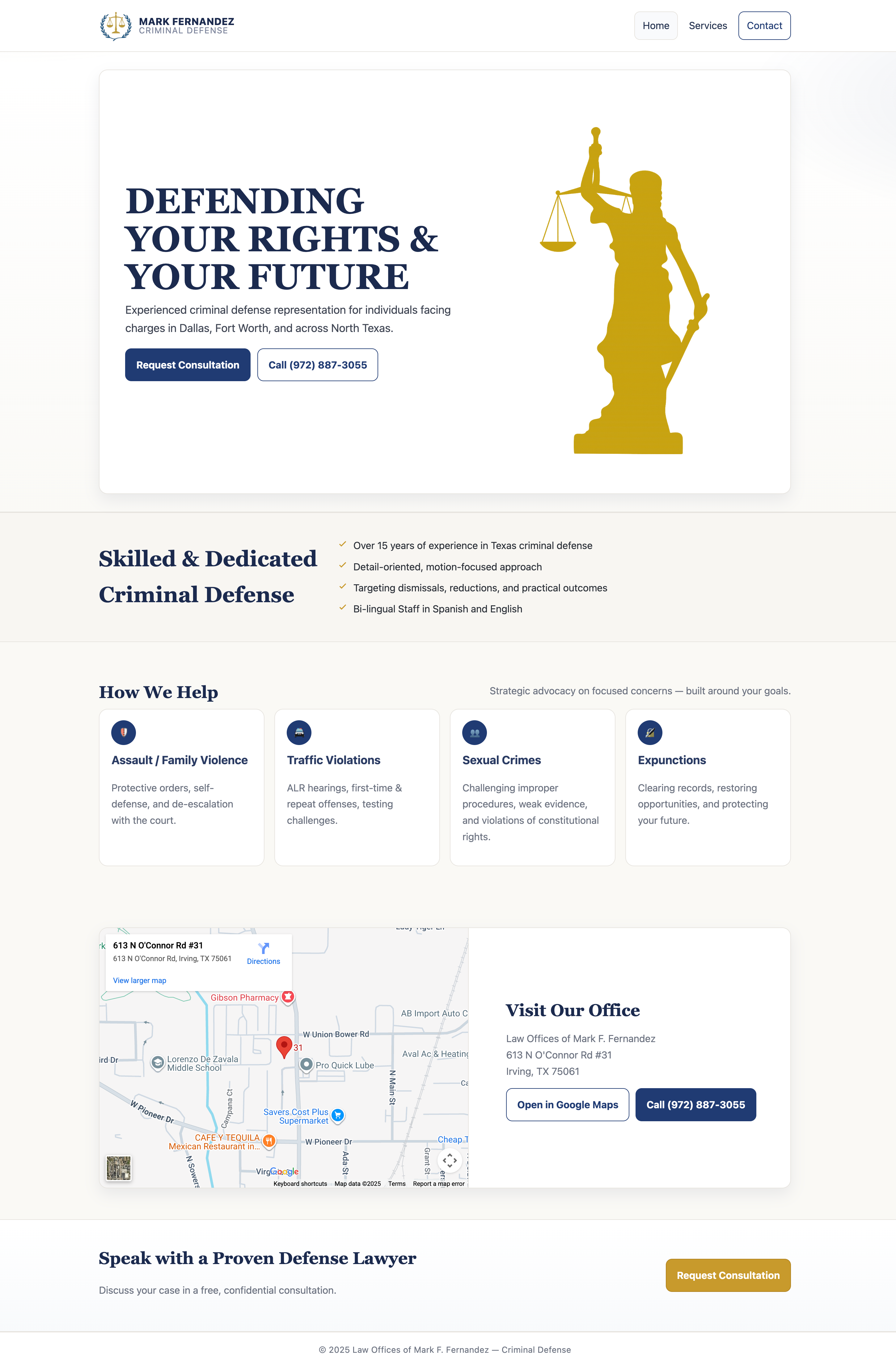 A criminal-defense homepage that communicates experience, decisiveness, and human support—without feeling aggressive or overwhelming for visitors already under stress.